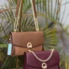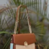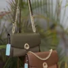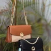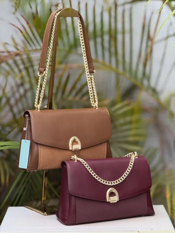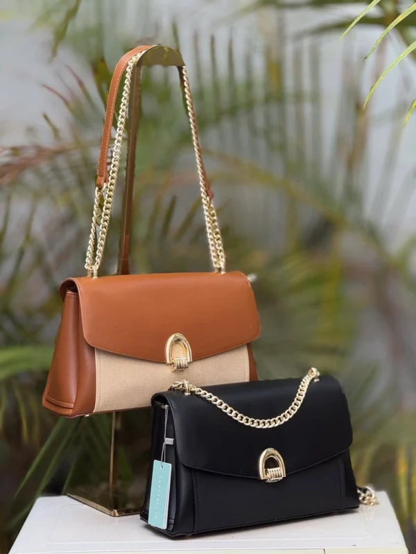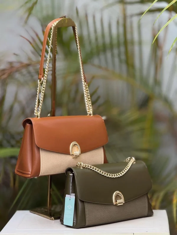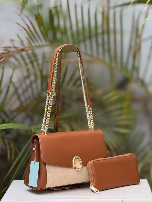 A refined Chrisbella shoulder bag featuring a premium leather–canvas combination and a signature gold chain strap. Elegant, structured, and perfect for both daily wear and special outings. Comes with a matching wallet.